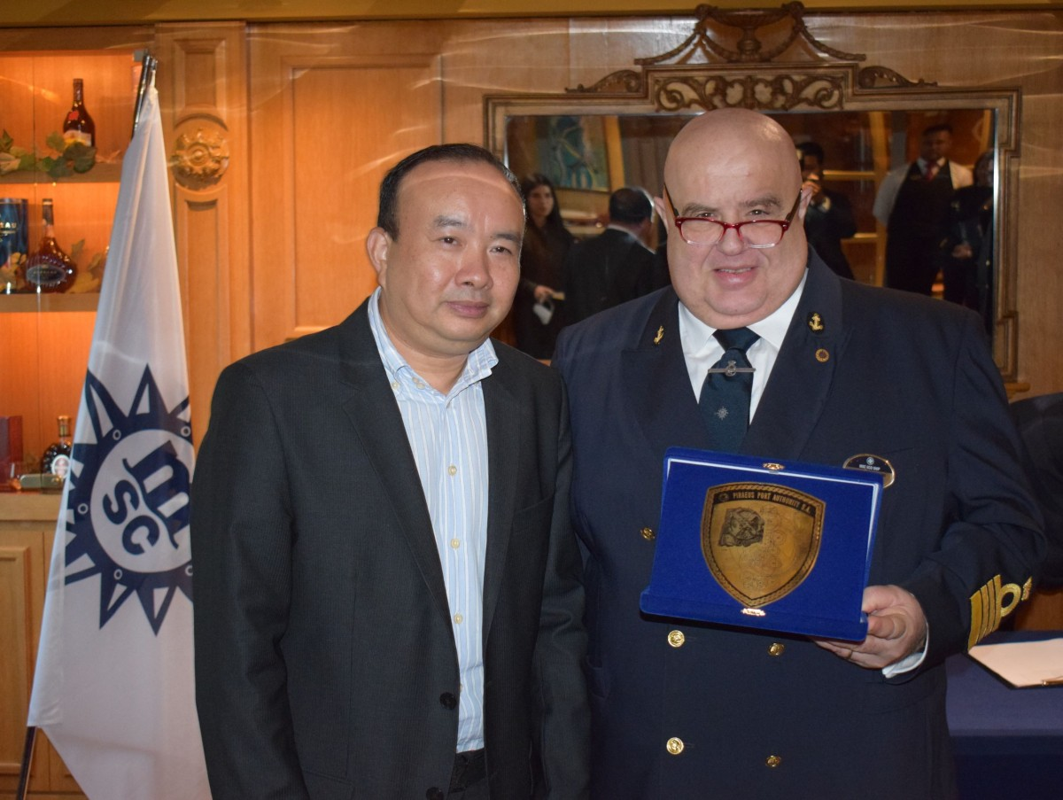 Η Διοίκηση της ΟΛΠ Α.Ε. καλωσόρισε το πλοίο MSC Sinfonia στον λιμένα Πειραιά για το έτος 2025, διοργανώνοντας ειδική εκδήλωση κατά την οποία ο DCEO της ΟΛΠ Α.Ε. Cpt. Jin Beiyuan αντάλλαξε τιμητικές πλακέτες με τον Cpt. του πλοίου Mr. Giuseppe Gazzano.