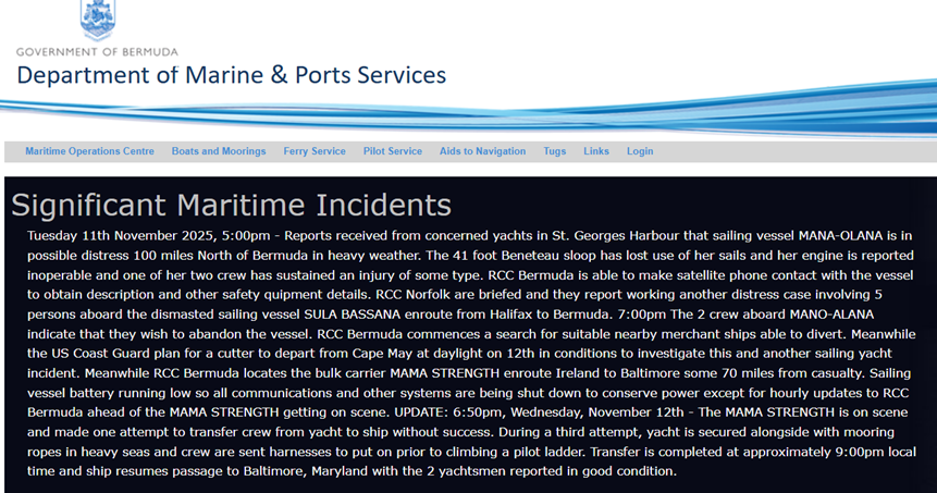 At the time, the sailing vessel battery was running low. “All communications and other systems are being shut down to conserve power except for hourly updates to RCC Bermuda ahead of the Mama Strength getting on scene,” the incident report by the Department of Marine and Ports Services said.